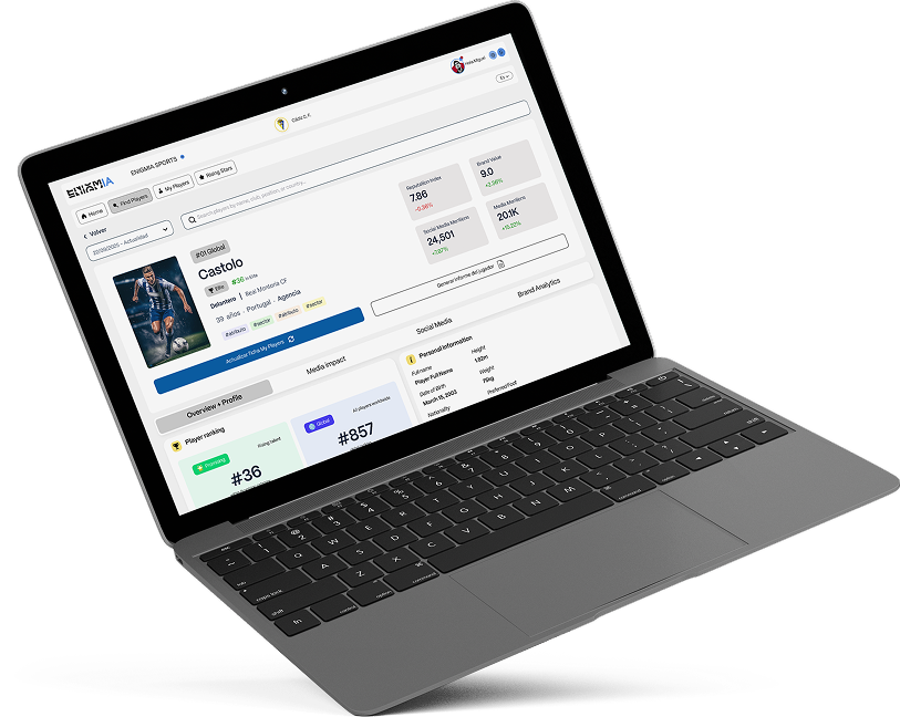 Análisis completo de cada jugador: historia, picos en medios, emociones en redes, personalidad, valor comercial y sectores afines. Todo lo que necesitas para convencer a la directiva, patrocinadores o clientes.