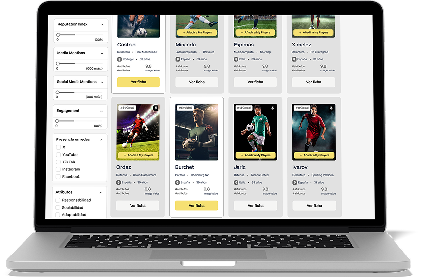 Análisis completo de cada jugador: historia, picos en medios, emociones en redes, personalidad, valor comercial y sectores afines. Todo lo que necesitas para convencer a la directiva, patrocinadores o clientes.